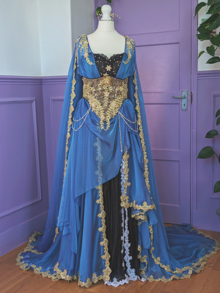 This is another costume where my client gave me complete creative freedom to make what I thought would be beautiful. She wanted a Persephone costume fit for the queen of the underworld with inspiration from Greek gowns. She wanted black and blue colours with gold and white details. So that’s exactly what I created for her. The gown is made from layers and layers of silky black and blue fabrics to have that draped Greek goddess look. All the layers have lace trimmings to properly show off all parts of the costume. It also has a corset with a black satin base and lots and lots of golden details. I also made some hand strung beaded strings with golden and white beads to make her look even more royal and beautiful. She’s also covered in rhinestones and beads to make her sparkle when the light hits the costume and when she moves around.