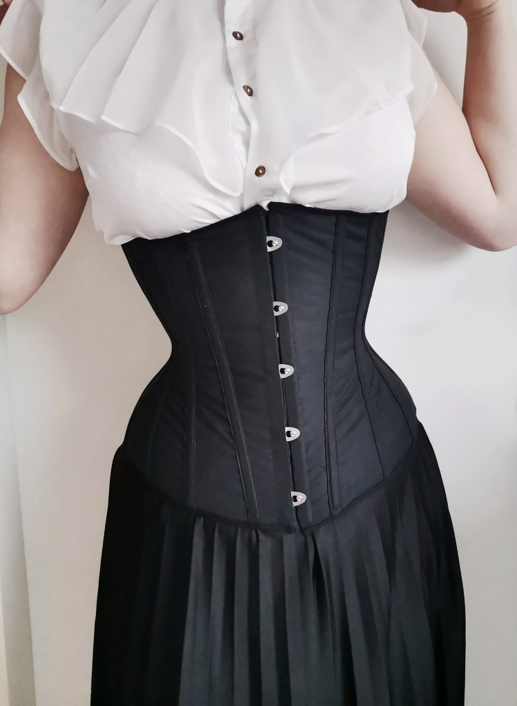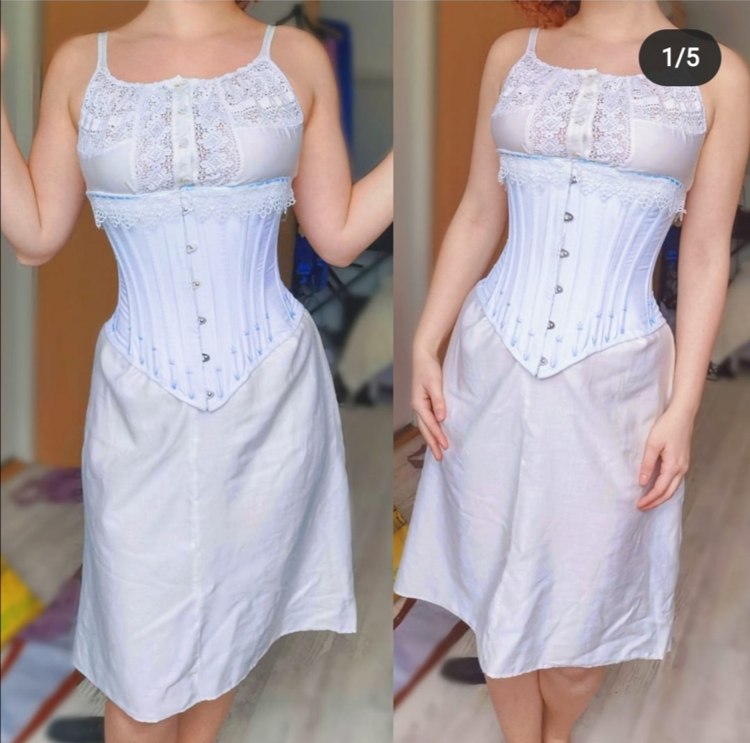 The corset is made from two layers of white cotton and has external boning channels with spiral steel boning inside. The front closes with a busk closure and the eyelets on the back are handsewn.
