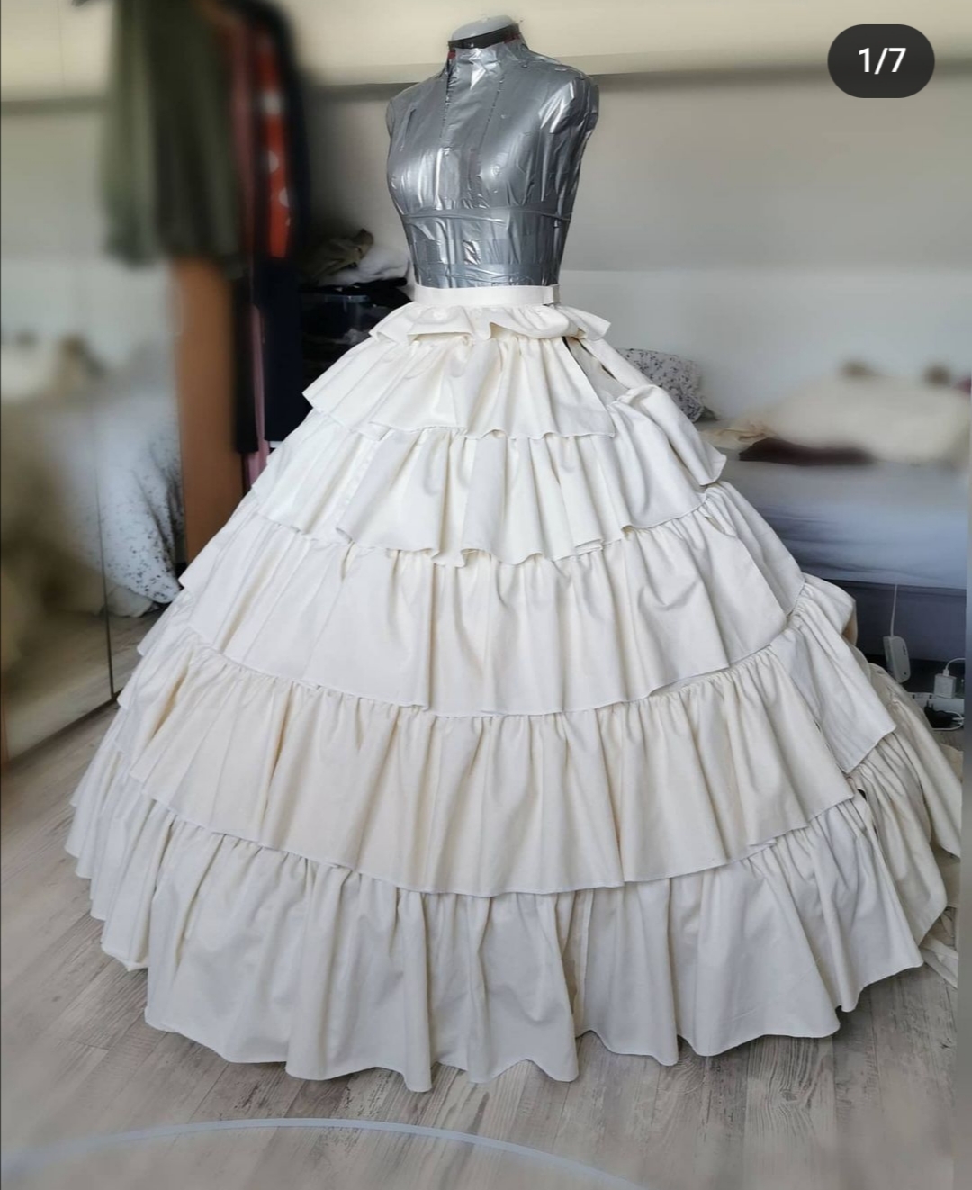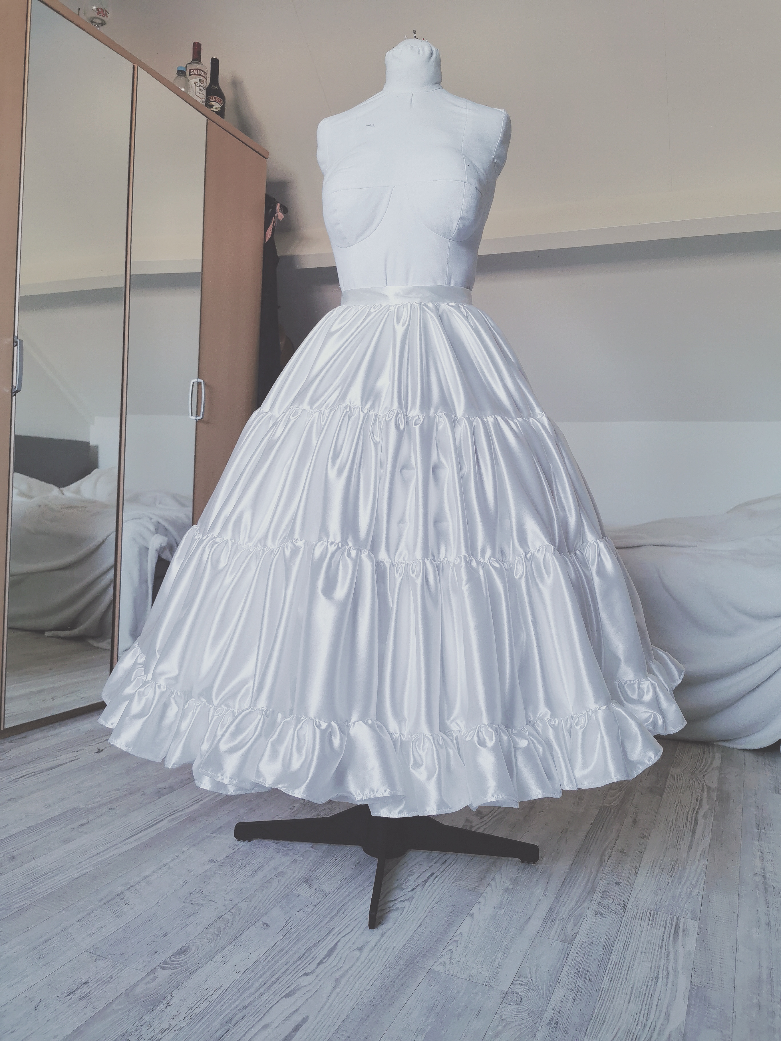 I’ve always dreamt of wearing a ballgown on my wedding, because I’ve always been obsessed with big gowns. The skirt is made from a petticoat made from layers of hard tulle. On top of that is a satin lining skirt so it wouldn’t be entirely see through. On top of the lining skirt are 7 layers of double circle skirts made from a soft ivory tulle. Then a layer of a beautiful sparkly lace fabric that I absolutely fell in love with. Then on top of the lace there is one more layer of a double tulle circle skirt. The skirt was so big and fluffy and I felt like a true princess.
