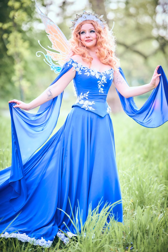 This baby blue tule fantasy gown is a project I did as a group with my friends. We decided to go to a convention all dressed as fairies. We all picked a color we liked, so I decided to go for blue.