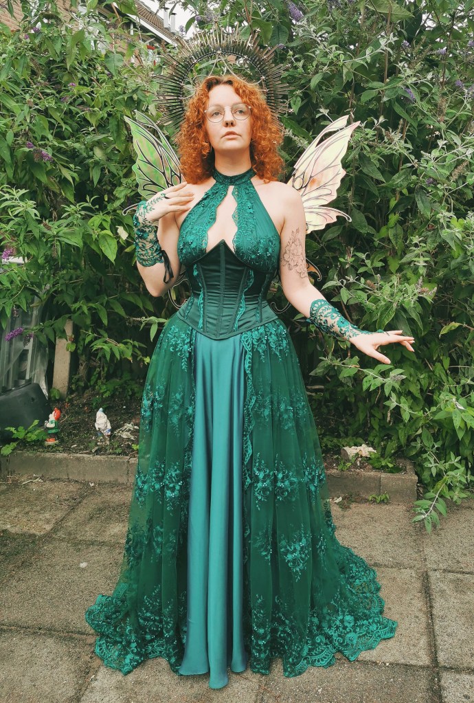 I love couture fashion and that was my goal for this costume. I made a full corset bodysuit that’s perfectly tailored to my body. On top of that I draped layers of fabric. These layers are mostly handsewed to the bodice.